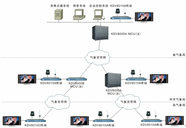 整個系統(tǒng)依托云南省氣象局自建的寬帶IP網絡進行搭建。省氣象局與各州市氣象局的網絡連接可為視頻會議提供2M通信帶寬。各州市氣象局與各縣級氣象局的網絡連接可為視頻會議提供768K通信帶寬。整個系統(tǒng)采用MCU兩級級聯(lián)組網。