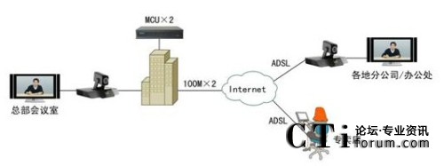 整個方案在部署上極其簡單,紅豆集團(tuán)總部架設(shè)一臺KDV8000C多點(diǎn)控制單元和一臺KDV8000E多點(diǎn)控制單元,全國各地分公司/辦事處的會議室各部署一套TrueSens硬件視頻會議終端,而遍布全國的紅豆男裝專賣店、軒帝尼專賣店內(nèi)則分別部署一套科達(dá)軟件視頻會議終端。集團(tuán)總部采用電信、聯(lián)通的百兆寬帶各一條,各地的分支機(jī)構(gòu)和專賣店則均通過普通的ADSL接入。系統(tǒng)拓?fù)鋱D如下: