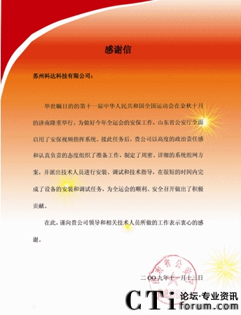 CTI論壇(ctiforum)12月29日消息(記者 張塵):日前 ,山東省公安廳向蘇州科達(dá)科技有限公司發(fā)來感謝信,對蘇州科達(dá)為保障全運(yùn)會(huì)順利、安全召開所做的貢獻(xiàn)表示衷心的感謝。
