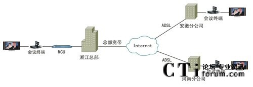 該套視頻會(huì)議系統(tǒng)最大的特點(diǎn)就是擁有超強(qiáng)的網(wǎng)絡(luò)適應(yīng)性。由于采用了高效視音頻編碼技術(shù)和大量智能化網(wǎng)絡(luò)適應(yīng)技術(shù),無(wú)論是ADSL、光纖還是VPN,均可進(jìn)行快速接入,并充分保證在Internet環(huán)境下的會(huì)議效果。因此,天元置業(yè)此次視頻會(huì)議系統(tǒng)就是完全基于公司現(xiàn)有的Internet進(jìn)行部署的。如圖1。