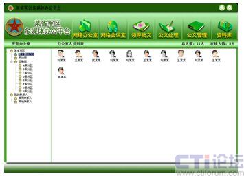 如圖所示的畫面即為網(wǎng)動(dòng)協(xié)同辦公系統(tǒng)的基礎(chǔ)工具——協(xié)同通訊系統(tǒng),該系統(tǒng)可將部隊(duì)機(jī)構(gòu)內(nèi)的所有部門、人員按照實(shí)際的組織結(jié)構(gòu)列出,應(yīng)用該系統(tǒng)的人員通過(guò)點(diǎn)擊其他在線人員,從而有選擇性的與對(duì)方進(jìn)行語(yǔ)音、視頻、數(shù)據(jù)共享、點(diǎn)對(duì)點(diǎn)會(huì)議等各種操作,將以往“看不見(jiàn)”的對(duì)話變?yōu)椤懊鎸?duì)面”的交流。相比于傳統(tǒng)的電話溝通而言,它不僅更暢通快捷,更可以最大化的降低溝通成本。另外,數(shù)據(jù)共享功能還可以將軍隊(duì)里需共同探討的話題,如作戰(zhàn)地圖動(dòng)態(tài)研究、工作報(bào)告資料等實(shí)時(shí)顯示在數(shù)據(jù)區(qū)中,雙方通過(guò)電腦即可進(jìn)行遠(yuǎn)程的話題討論、圈點(diǎn)批注。