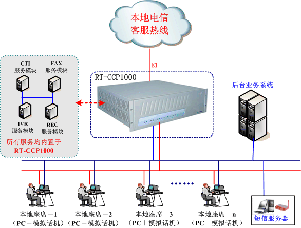 隨著RT-CCP1000呼叫中心系統(tǒng)的順利上線,徹底打破了申銀萬(wàn)國(guó)以往的被動(dòng)服務(wù)模式,將部分被動(dòng)服務(wù)變主動(dòng)服務(wù)模式同時(shí),在融天科技的指導(dǎo)下,將外呼服務(wù)、傳真服務(wù)、留言信箱、短信功能以及外呼模塊有效的結(jié)合起來,同時(shí)整合申銀萬(wàn)國(guó)的各項(xiàng)資源進(jìn)行了客戶資源挖掘,為申銀萬(wàn)國(guó)產(chǎn)生了巨大的商業(yè)價(jià)值,RT-CCP1000呼叫中心系統(tǒng)從為客戶提供服務(wù)變?yōu)榱酥苯赢a(chǎn)生利潤(rùn)呼叫中心系統(tǒng),目前已經(jīng)被申銀萬(wàn)國(guó)當(dāng)作了業(yè)務(wù)轉(zhuǎn)型、創(chuàng)新亮點(diǎn)、爭(zhēng)奪客戶資源、體現(xiàn)企業(yè)實(shí)力的重要手段。統(tǒng)組網(wǎng)大致如下: