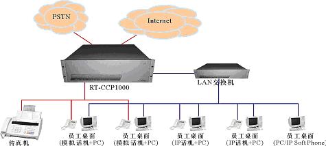 - 用單個RT-CCP1000取代原有系統(tǒng)的傳統(tǒng)PBX和代理服務(wù)器,提供電話系統(tǒng)功能和Internet接入。