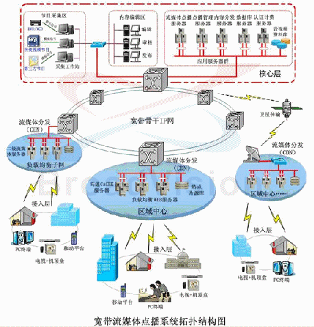 - 寬帶流媒體運(yùn)營管理支撐系統(tǒng),包括點(diǎn)播內(nèi)容的采集、管理、內(nèi)容分發(fā)、負(fù)載均衡、計(jì)費(fèi)等功能模塊;