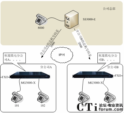 圖一:方案1:SS3000-E與IPPBX MG3000-R32聯(lián)合組網(wǎng)示意圖