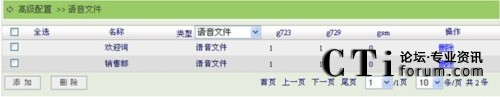 點擊“高級配置”菜單的“語音文件”子菜單,進入語音文件頁面,在類型選項中可以選擇顯示語音文件或音樂保持文件,語音文件指的是語音菜單、振鈴組等業(yè)務(wù)使用的語音文件;音樂保持文件指的是呼叫保持,三方通話等業(yè)務(wù)用戶聽到的音樂保持文件。如下圖所示: