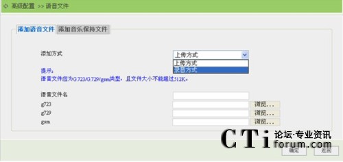 在定制語音菜單時,經(jīng)常要提供聲音文件,目前系統(tǒng)支持G.723、G.729和gsm(針對G.711a和G.711u)類型的語音文件和音樂保持文件,單個文件大小不能超過512K。MG3000-X中的語音文件可以通過錄制或者上傳方式提供。