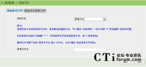 選擇錄音方式添加語音文件時,使用分機撥打電話錄制語音文件功能鍵“*77”,聽到滴聲后開始錄制,按“#”號結(jié)束錄制。然后通過“高級配置”->“語音文件”,點擊“添加”鏈接按鈕進入添加語音文件頁面,選擇添加方式為錄音方式,在語音文件名處為剛剛電話錄制的音文件,添加一個文件名后,點擊“確定”完成語音文件添加,如下圖所示: