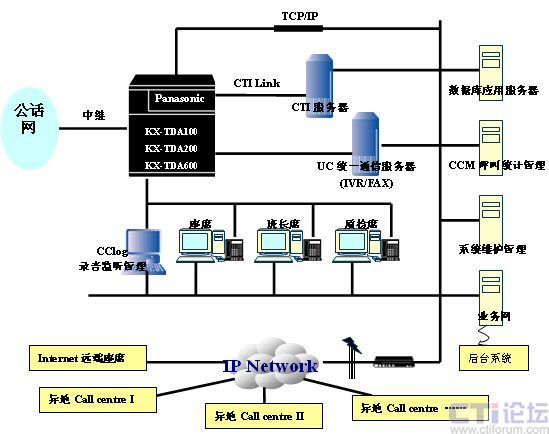 采用Panasonic TDA系列交換機,本身提供自動呼叫排隊ICD功能,通過LAN網絡接口與計算機建立CTI通信連接,支持CSTA Ⅲ標準。 系統(tǒng)可提供ISDN數字中繼和模擬中繼,實現與電信公網連接,通過數字分機板與數字話機建立連接,通過模擬分機板與模擬話機和模擬語音傳真卡建立連接,通過混合分機板與數字話機和模擬話機建立連接。