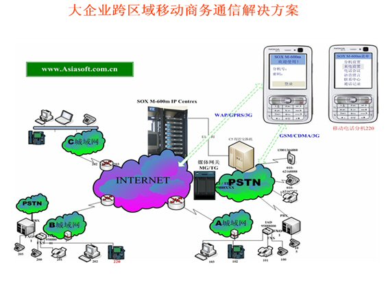 該方案為企業(yè)提供了跨地域的低成本、高效率、方便靈活的IP融合通信基本服務(wù)和增值服務(wù),使用SOX-M就不再有地域限制,宛如本地化電話分機(jī)辦公通信一樣,而且還可以享有更多的增值服務(wù):語音信箱、電話會(huì)議、一號通、等候音樂、語音菜單、呼叫篩選等等,更具特色的是提供了融合通信的新型“移動(dòng)總機(jī)”和“移動(dòng)分機(jī)”服務(wù),可以使我們手里的移動(dòng)電話(即手機(jī))完全成為辦公室分機(jī),可以在手機(jī)上完成固定分機(jī)的PBX特性功能,如在線轉(zhuǎn)接,即時(shí)會(huì)議等,通過SOX-M可以直接管理分機(jī)各種設(shè)置,如“來電管理、手機(jī)聽取語音留言、WAP上召開電話會(huì)議、聯(lián)系中心(CRM)WAP點(diǎn)擊呼叫”等等,實(shí)現(xiàn)了語音和數(shù)據(jù)融合通信給企業(yè)帶來的更多好處。