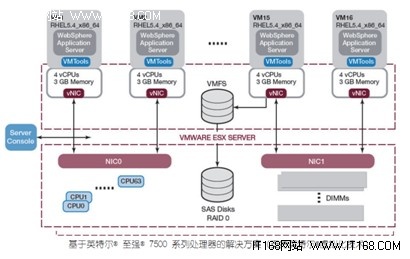 另外,由于電信行業(yè)的特殊性,許多舊的應(yīng)用無法快速有效的部署在新平臺(tái)下,造成服務(wù)器利用低,服務(wù)器的數(shù)量越來越多的問題,為此,英特爾與東軟也從幾年前開始進(jìn)行密切合作,在早期的英特爾至強(qiáng)7300、至強(qiáng)7400、至強(qiáng)7500等一系列四路高端服務(wù)器平臺(tái)上搭建了虛擬化解決方案,使過去電信舊的應(yīng)用能夠很快在新平臺(tái)上進(jìn)行部署。下圖顯示的是東軟以兩臺(tái)基于英特爾至強(qiáng) 7500 系列處理器的四路服務(wù)器為基礎(chǔ),構(gòu)建了整個(gè) BSS 架構(gòu):