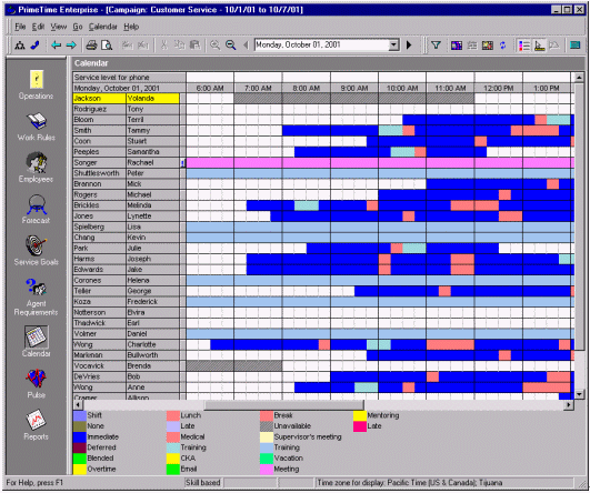 絕大多數(shù)的WFMS可以通過歷史數(shù)據(jù)和人員情況自動(dòng)生成排班表。而且它也只是簡單的根據(jù)呼叫中心的運(yùn)營時(shí)間來排班。舉個(gè)例子,某個(gè)呼叫中心在排班是有兩個(gè)班,一個(gè)工作時(shí)間是早7點(diǎn)到下午3點(diǎn),另一個(gè)是早九點(diǎn)到晚五點(diǎn),這就意味著不僅要安排早、晚休息,還要顧及到午休的時(shí)間。休息的安排要保證能夠在電話的持續(xù)中也能有持續(xù)的人員保證電話量。在這個(gè)自動(dòng)化軟件的之中還有一個(gè)因素要能夠?qū)崿F(xiàn)自動(dòng)化--人的因素。例如:Mary和Jane想同時(shí)去吃午餐,然而自動(dòng)化的排班表并不是這樣的。然而主管根據(jù)當(dāng)時(shí)的話務(wù)量情況和工作狀況以及工作規(guī)范批準(zhǔn)了Mary和Jane共享午餐的要求,而WFMS就要能夠處理這樣很有可能發(fā)生,而且是合理的情況。排班表的更改應(yīng)該就是簡單的拖拽圖標(biāo)就應(yīng)該能夠?qū)崿F(xiàn)的功能,并且能夠在這種更改會(huì)對(duì)預(yù)測的話務(wù)量差生不好影響時(shí),拒絕這種拖拽行為。