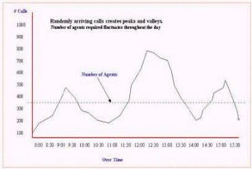 Inbound的來話量成不規(guī)則的波形圖,形成這種不規(guī)則波形圖中波峰和波谷的原因是在這些波峰和波谷工作的員工數(shù)量。(見圖8.來話量的分布圖)這將對(duì)在一天中的每個(gè)時(shí)段能夠分配最理想的員工來工作造成了最大的困難。一個(gè)小時(shí)能可能從來話量的波峰到達(dá)波谷,管理人員如何排班來匹配話務(wù)量對(duì)人員的要求,這是很多人的困惑。下圖描繪了某個(gè)呼叫中心8小時(shí)來話量分布情況。
