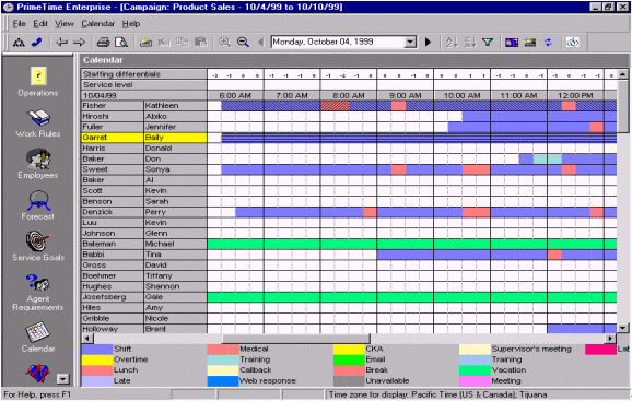 人員預(yù)測是一個(gè)每天、每周、每月、每年都需要作的工作計(jì)劃,為了能夠平衡呼叫中心人員的工作量和人員的可用性。通過將歷史數(shù)據(jù)和人員數(shù)據(jù)整合、加以分析,并借以WFMS體現(xiàn)出分配多少員工就可以達(dá)到既定的服務(wù)水準(zhǔn)。一旦需要員工數(shù)量被估算出來,那么工作安排也就是每天、每周、每月、每天的排班表的輪廓也就出來了。絕大多數(shù)的WFMS軟件的界面和操作都很相似,最主要的就是內(nèi)容就是要包含員工的姓名、員工的工作時(shí)間、員工的其他日程(最小單位是15分鐘),并且能夠提供具有多個(gè)管理軟件接口,和多種不同的管理方式。圖9.就是一個(gè)典型的人員排班表,以15分鐘為單位體現(xiàn)人員的工作安排。附加選項(xiàng)還可以包含"休假""遲到""曠工"等等,并且這排班表還可以通過歷史數(shù)據(jù)體現(xiàn)出哪個(gè)時(shí)段可能出現(xiàn)人員不足哪個(gè)時(shí)段容易出現(xiàn)人員過,F(xiàn)象。