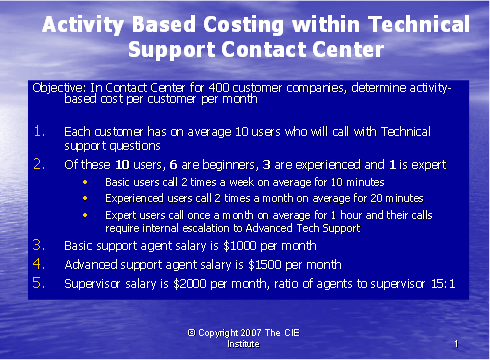 呼叫中心業(yè)務(wù)包括大量單獨的行動 — 行動成本法(ABC)使我們跟蹤那些行動以至于更清楚地了解支持一個客戶的所需事項。傳統(tǒng)上,呼叫中心成本是根據(jù)投入來衡量的:人數(shù),設(shè)備量,設(shè)施的規(guī)模。為了了解服務(wù)一個客戶所花費(fèi)的成本量,呼叫中心的主管必須確定這些行動如何與該客戶相聯(lián)系的。只有做到這一點,行業(yè)才能知道來自該客戶的收入是否超出為其提供服務(wù)所產(chǎn)生的成本。如果服務(wù)的成本大于收入,那么這個客戶對于行業(yè)來說是無利可圖的,所以確定哪些客戶有利可圖和哪些客戶無利可圖是很重要的,這樣,行業(yè)才可以根據(jù)客戶定價和客戶服務(wù)策略有利地進(jìn)行管理。