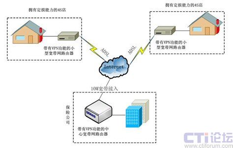 在保險公司數(shù)據(jù)交換控制中心配置一臺具有VPN功能的中心寬帶網(wǎng)路由器,每條ADSL配置一個具有VPN功能的小型寬帶網(wǎng)路由器,并通過設(shè)置路由器即可成功建立起VPN網(wǎng)絡(luò)。這種網(wǎng)絡(luò)結(jié)構(gòu)不但有效的節(jié)約了成本,而且日后系統(tǒng)的擴容的成本也非常的低,每增加一個點只需要申請一條ADSL就可以了。