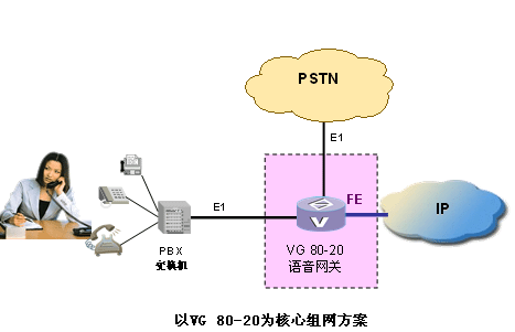 將VG 80-20連接在在PBX和PSTN網(wǎng)之間,使用VG 80-20的一個E1語音接口連接PSTN,另一個E1語音接口連接PBX。由語音網(wǎng)關(guān)根據(jù)撥號策略決定使用PSTN呼叫還是VoIP呼叫,實現(xiàn)自動選路功能。這樣可以在撥號方式和電話號碼也不需要作任何改變的情況下,實現(xiàn)長途旁路IP電話功能。