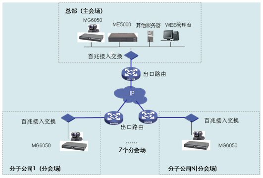 集團總部主會場和各個分會場各部署一臺H3C公司的MG6050多媒體網(wǎng)關(guān),同時支持H.323和SIP協(xié)議,支持H.263/H.264編碼技術(shù)和4CIF高清晰圖像分辨率,最高可以提供2M會議帶寬。集團總部主會場和各個分會場推薦使用Sony