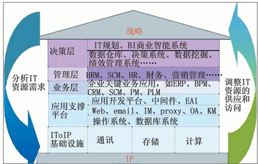 按照華為3Com的構想,如果把整個IT系統(tǒng)比做一座房屋,那么整個房屋的地基就是IP網(wǎng)絡,需要基于IP網(wǎng)絡來構建通信、存儲、計算等IT基礎設施。在這些基礎設施之上,則是應用支撐平臺(操作系統(tǒng)、數(shù)據(jù)庫系統(tǒng)、應用開發(fā)平臺等),基于應用支撐平臺提供給機構的關鍵業(yè)務流程信息系統(tǒng)(如ERP、SCM等),最終為用戶的管理和決策提供支持。“在戰(zhàn)略與IT基礎設施之間實現(xiàn)實時同步互動,IT為用戶高層提供商業(yè)智能系統(tǒng)、決策系統(tǒng),以便決策層即時掌握信息,作為機構戰(zhàn)略決策、戰(zhàn)略挑戰(zhàn)的依據(jù);用戶可以依據(jù)內(nèi)、外部變化,進行戰(zhàn)略調(diào)整時快速分析新的IT資源需求,同步調(diào)整IT資源的配置,從而使IT與業(yè)務戰(zhàn)略保持同步!边@正是IToIP的基本理念。