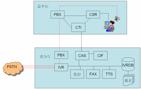 - 各分行采用IVR前置模式,通過PSTN直接接入到IVR服務器坐自動語音服務。