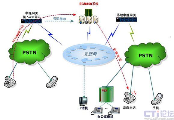 申請(qǐng)到400號(hào)碼的服務(wù)商,通過TG中繼網(wǎng)關(guān),把400號(hào)指向ECM400系統(tǒng),從而在IP網(wǎng)和PSTN網(wǎng)上建立了一個(gè)完美的過渡橋梁,對(duì)不同的通訊方式進(jìn)行了有效融合,能充分整合雙網(wǎng)的各種資源和功能,從而達(dá)到為企業(yè)提供更多、更好服務(wù)的目的。