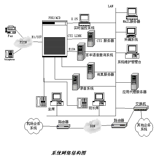 本系統(tǒng)采用E1數(shù)字中繼線接入電話網(wǎng),成為能夠在聲訊臺或機(jī)場獨(dú)立運(yùn)行的系統(tǒng)。