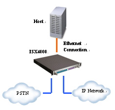 下圖顯示了一個(gè)小容量iSX4000 UAP系統(tǒng),該系統(tǒng)由一臺(tái)iSX4000 交換機(jī)和一臺(tái)主機(jī)服務(wù)器構(gòu)成,主機(jī)上運(yùn)行所有的軟件,包括主控軟件、用戶(hù)應(yīng)用程序和
