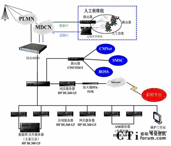 平臺(tái)核心話路接入集在中毅航通信iSX4000智能業(yè)務(wù)交換機(jī)的IVR自動(dòng)語音平臺(tái),人工坐席平臺(tái)通過和系統(tǒng)支撐軟件實(shí)現(xiàn)遠(yuǎn)端坐席功能,通過專線中繼與IVR平臺(tái)實(shí)現(xiàn)話路連接;InterNet與IVR平臺(tái)實(shí)現(xiàn)數(shù)據(jù)同步。根據(jù)移動(dòng)交換網(wǎng)傳輸內(nèi)容選擇應(yīng)相的IVR自動(dòng)語音服務(wù)或人工坐席服務(wù)。