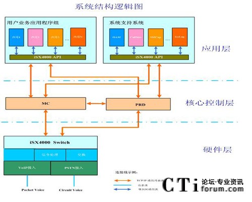 MC是整個的系統(tǒng)控制核心,其完成對iSX4000 交換機的所有控制功能,包括系統(tǒng)配置管理、呼叫控制、媒體網(wǎng)關控制和媒體資源管理等。應用層的業(yè)務應用程序發(fā)起的所有控制命令,通過MC路由到指定的iSX4000交換機上,并由iSX4000交換機最終完成指定的操作,而操作的結果最終通過MC,返回給業(yè)務應用程序。同理,由iSX4000交換機發(fā)起的控制信號,亦是通過MC來派發(fā)給特定的業(yè)務應用程序,業(yè)務應用程序處理后,通過MC反饋給iSX4000交換機。