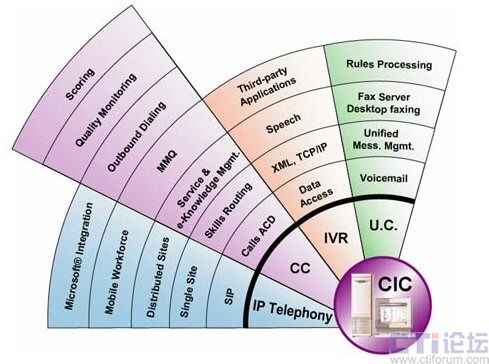CIC平臺是一套符合呼叫中心營運(yùn)所需,且有其營運(yùn)所需模塊的All In One設(shè)備,如數(shù)字交換機(jī)、PABX、CTI、IVR、ACD、 Screen Pop、數(shù)據(jù)庫整合、網(wǎng)站整合服務(wù)(Web Call Back、Web Chat、VON、E-mail)、傳真服務(wù)器、傳真自動回復(fù)、Dialer、Scripter、在線錄音...等所有功能,采用CIC平臺的系統(tǒng)比基于傳統(tǒng)PBX的系統(tǒng)更加易于維護(hù)。 CIC為企業(yè)體帶來一個功能齊備,技術(shù)人員及值機(jī)人員可以自己完全掌握的Call Center系統(tǒng),并且也是一個最上算投資報酬率ROI(Return Of Investment)的解決方案。