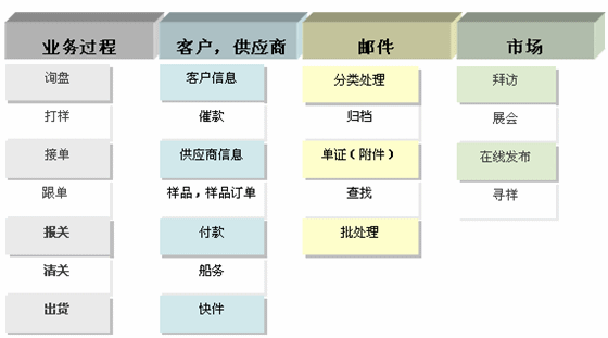 外貿(mào)企業(yè)主要通過(guò)Email的方式與客戶及潛在客戶進(jìn)行業(yè)務(wù)聯(lián)系。由于一般Email系統(tǒng)的客戶端都是相對(duì)獨(dú)立的,業(yè)務(wù)郵件都分散在各業(yè)務(wù)員的Email系統(tǒng)中,客戶資源的統(tǒng)一管理、Email的監(jiān)督、審批、歸檔管理是使外貿(mào)企業(yè)頭疼的問(wèn)題。