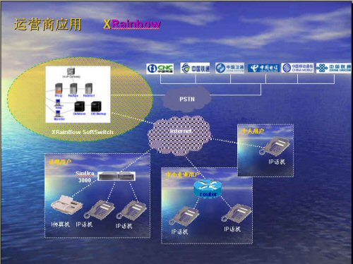 。。首先我們需要這4個地點都有自己的網(wǎng)絡(luò)接入,最好是寬帶。以北京總部為列,如果將Xrainbow系統(tǒng)放在北京總部,這就需要北京總部這邊有一個固定IP地址的網(wǎng)絡(luò)接入,其他分公司不需要固定ip地址,只要可以上網(wǎng)就可以登錄到北京總部的Xrainbow系統(tǒng)。這樣企業(yè)與分支機構(gòu)之間就實現(xiàn)了零話費,同時還可以提供傳真業(yè)務(wù)。另外終端設(shè)備可以隨意移動,只要可以上網(wǎng)的地方就可以接入我們的終端設(shè)備,免去了因公司的發(fā)展或者搬動而要去申請初裝大量電話的煩惱。