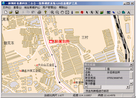 - 地圖維護功能:提供圖層數(shù)據(jù)管理、空間數(shù)據(jù)管理、圖形編輯管理,系統(tǒng)還提供大量的點、線、區(qū)域的形狀元素,可添加修改點(公安、消防、醫(yī)院等重點單位)、線(道路等)、面(街區(qū)、轄區(qū)等)等地理要素以及對地理要素的名稱、電話號碼等相關(guān)信息進行查看與修改。