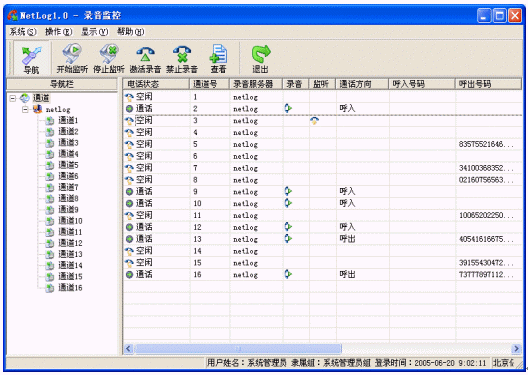 Netlog系統(tǒng)中控制臺是一個統(tǒng)一配置和管理的平臺,可以部署在網(wǎng)絡(luò)內(nèi)的任意一臺主機上,各個功能模塊都可以單獨工作,也可以同時使用,控制臺所有模塊可以通過系統(tǒng)導(dǎo)航(ToolBar)來引導(dǎo)啟動。用戶可以通過控制臺操作網(wǎng)絡(luò)上所有記錄服務(wù)、數(shù)據(jù)服務(wù)和文件服務(wù)?刂婆_作為最終用戶終端可以完成用戶的所有操作,設(shè)置每個服務(wù)器甚至每個通道的屬性、執(zhí)行各種用戶操作、指定服務(wù)的工作方式、錄音查詢、錄音管理、輸出報表、排班等。控制臺根據(jù)用戶權(quán)限的不同限定用戶的操作,更好的保障了系統(tǒng)的運行和語音記錄文件的安全。