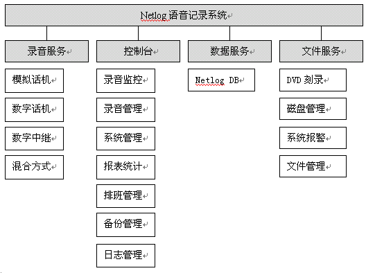 NetLog語音記錄系統(tǒng)采用基于分布式、多層控制管理體系的設(shè)計思想,將電話線路與內(nèi)部網(wǎng)絡(luò)有效地結(jié)合在一起,形成一套完整的語音錄制、管理系統(tǒng)。采用目前先進(jìn)的C/S模型,能更方便、快捷地實(shí)現(xiàn)控制臺對網(wǎng)絡(luò)內(nèi)所有記錄服務(wù)的狀態(tài)監(jiān)視,記錄查詢,操作控制等,采用統(tǒng)一的管理化機(jī)制,使文件的管理和備份更簡潔。