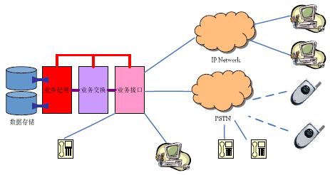 其中,業(yè)務接口部分為呼叫中心提供面向服務服務對象(客戶)的連接和面向服務者(座席)的連接接口,業(yè)務交換部分負責在請求服務的對象與提供服務提供者之間建立連接,業(yè)務處理部分負責對這些連接及服務內容進行管理和維護,數據存儲部分則為所有服務提供必要的數據資源和數據備份。