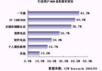 NGN 成為電信運(yùn)營商滿足用戶需求的有力武器。不同的行業(yè)用戶對基于 NGN 推出的電信業(yè)務(wù)表現(xiàn)出了較大的需求差異,例如: IT通信、物流和服務(wù)業(yè)對 IP CENTREX 、多媒體視頻會議和寬帶電話等業(yè)務(wù)比較感興趣,而政府用戶對一號通等業(yè)務(wù)比較感興趣。不同行業(yè)對業(yè)務(wù)需求具有差異性,這就要求運(yùn)營商基于 NGN 平臺開發(fā)的業(yè)務(wù)要有更大的靈活性,要有突出用戶通信需求的整體解決方案,要能滿足用戶的個性化需求。