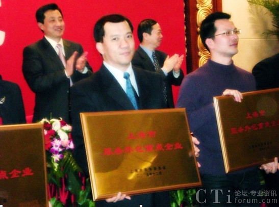 CTI論壇(ctiforum)1月27日消息(記者 張塵):2010年1月20日,上海市商務(wù)委員會(huì)舉行服務(wù)外包示范區(qū)和重點(diǎn)企業(yè)授牌儀式,上海市副市長(zhǎng)唐登杰親臨會(huì)場(chǎng),并向陸家嘴軟件園、長(zhǎng)寧軟件園、天地軟件園三家專業(yè)園區(qū)以及44家服務(wù)外包重點(diǎn)企業(yè)授牌。