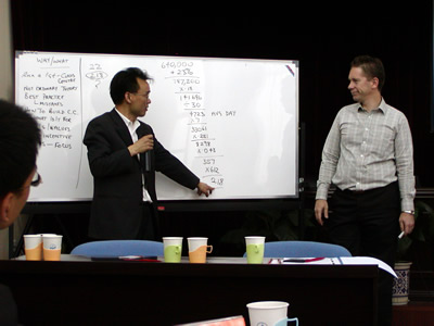 公開課在Simon Kriss先生詼諧的講課風(fēng)格的引導(dǎo)下自始至終在輕松、愉快又不失專業(yè)深度的氛圍中進(jìn)行著,而Simon Kriss先生以呼叫中心運(yùn)營管理的高效率為主題,從呼叫中心的環(huán)境布局、預(yù)測(cè)管理、人力資源管理、效率管理到專業(yè)報(bào)告形式等知識(shí)點(diǎn)上做了專業(yè)深入的講解。尤其在人力資源管理和效率管理方法的傳授時(shí)引發(fā)了全體學(xué)員極大的興趣和反應(yīng),例如:就人員附著度的定義及操作問題學(xué)員同講師展開了多倫次的討論。而Simon