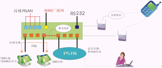 - 同時(shí)接入PSTN和專網(wǎng)電話,并在網(wǎng)關(guān)上實(shí)現(xiàn)內(nèi)部交換、語(yǔ)音信箱、和PSTN交換等功能