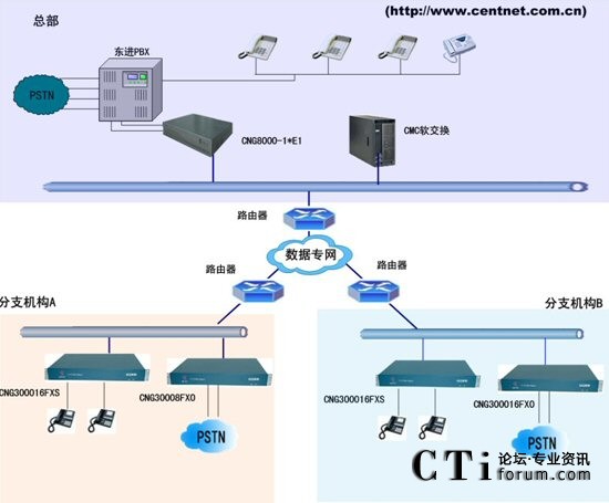 方案組網說明:通過呼叫中心服務器E1接口聯系數字中繼CNG8000-1*E1, 遠程座席接CNG3000FXS ,遠程PSTN接CNG3000FXO設備,上述設備統(tǒng)一注冊到CMC軟交換上。