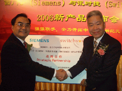 2006年3月29日的北京,還有些春風(fēng)料峭,但北京長(zhǎng)富宮的芙蓉廳卻是暖意融融,德國(guó)通訊業(yè)巨擘西門子(Siemens)和美國(guó)企業(yè)通訊業(yè)新寵訊時(shí)捷(Switchvox)聯(lián)合舉辦VoIP新產(chǎn)品發(fā)布會(huì),西門子終端通訊設(shè)備(上海)有限公司CEO
