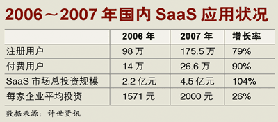 SaaS在中國正步入一個快速發(fā)展的時期。計世資訊調(diào)查數(shù)據(jù)顯示,2007年國內(nèi)SaaS市場在諸多積極因素的刺激下快速發(fā)展,用戶的投資額度和付費用戶數(shù)快速增長,使得企業(yè)用戶在在線管理服務(wù)的投入上有較快的增長。2007年企業(yè)用戶在SaaS上的平均投資額度比2006年增長了約26%。2007年管理型SaaS應(yīng)用的總投資規(guī)模為4.5億元,但與2007年管理軟件市場整體規(guī)模248億元比,目前在線管理服務(wù)市場規(guī)模仍然相當(dāng)小。