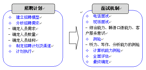 東軟呼叫中心充分挖掘東北地區(qū)豐富的韓語(yǔ)人才資源,通過(guò)多種招聘渠道滿足項(xiàng)目的人才需求。東軟自身的教育機(jī)構(gòu)--東軟信息學(xué)院也可以培養(yǎng)專(zhuān)業(yè)的韓語(yǔ)人才,另外,東軟信息學(xué)院與韓國(guó)某大學(xué)進(jìn)行戰(zhàn)略合作,通過(guò)為韓國(guó)留學(xué)生提供呼叫中心實(shí)習(xí)機(jī)會(huì)及漢語(yǔ)培訓(xùn)等,方式,吸引數(shù)名高素質(zhì)韓國(guó)大學(xué)生加入呼叫中心,充分滿足該項(xiàng)目對(duì)專(zhuān)業(yè)人才的需求。