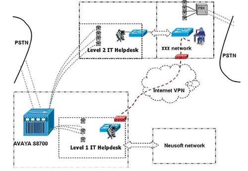 實(shí)施中,A公司的IT Helpdesk服務(wù)熱線號碼直接路由至東軟呼叫中心平臺,Level 1座席用東軟呼叫中心的分機(jī)提供在線服務(wù);Level