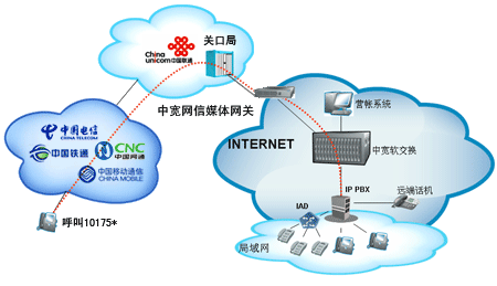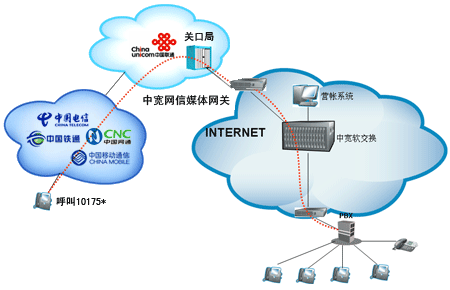 企業(yè)或個(gè)人自行從網(wǎng)站上成功申請(qǐng)“企業(yè)商務(wù)通”或“個(gè)人隨身行”業(yè)務(wù)后,通過101756*全國(guó)統(tǒng)一接入號(hào)結(jié)合中寬網(wǎng)信推薦的思科linksys網(wǎng)關(guān)或網(wǎng)絡(luò)電話使用,當(dāng)外部對(duì)您申請(qǐng)的10175*號(hào)碼發(fā)起呼叫時(shí),該呼叫通過中國(guó)聯(lián)通的線路將話務(wù)指向中寬網(wǎng)信的媒體網(wǎng)關(guān),由中寬軟交換平臺(tái)將呼叫送至您指定的電話上。另外,當(dāng)您使用該業(yè)務(wù)外呼時(shí),可以選擇在被叫電話上顯示10175*或隱藏號(hào)碼。