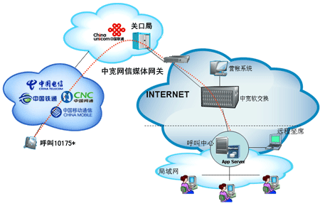 企業(yè)自行從網(wǎng)站上成功申請(qǐng)“企業(yè)商務(wù)通”業(yè)務(wù)后,通過101756*全國(guó)統(tǒng)一接入號(hào)結(jié)合呼叫中心,當(dāng)外部對(duì)企業(yè)申請(qǐng)的10175*號(hào)碼發(fā)起呼叫時(shí),該呼叫通過中國(guó)聯(lián)通的線路將話務(wù)指向中寬網(wǎng)信的媒體網(wǎng)關(guān),由中寬軟交換平臺(tái)將呼叫送至指定的呼叫中心,由呼叫中心完成相應(yīng)的服務(wù)。另外,當(dāng)您使用該業(yè)務(wù)外呼時(shí),可以選擇在被叫電話上顯示10175*或隱藏號(hào)碼。