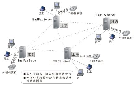 如果集團(tuán)各分支機(jī)構(gòu)都各使用一套EastFax,通過(guò)因特網(wǎng)的連接,可將企業(yè)分布在全球或全國(guó)的傳真并入集團(tuán)傳真服務(wù)器系統(tǒng),實(shí)現(xiàn)傳真線路自動(dòng)路由,這樣企業(yè)總部和各分支機(jī)構(gòu)之間的傳真通訊費(fèi)為零,如同內(nèi)部發(fā)送。如發(fā)送系統(tǒng)以外的長(zhǎng)途傳真,本地服務(wù)端智能識(shí)別,將傳真任務(wù)提交到與長(zhǎng)途傳真區(qū)號(hào)相匹配的傳真服務(wù)器上發(fā)送出去,從而將長(zhǎng)途傳真費(fèi)用減少為本地傳真通訊費(fèi)用。此功能節(jié)省了集團(tuán)系統(tǒng)內(nèi)部發(fā)送傳真的費(fèi)用,節(jié)省高額的長(zhǎng)途電話費(fèi)用。適用于多分支機(jī)構(gòu)的集團(tuán)公司。