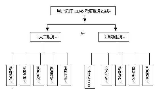 當(dāng)用戶撥通"12345"電話并選擇自動(dòng)服務(wù)時(shí),聲訊臺(tái)自動(dòng)播放引導(dǎo)語"選擇市長信箱留言請(qǐng)按1,自動(dòng)投訴舉報(bào)請(qǐng)按2,投訴查詢請(qǐng)按3,服務(wù)咨詢請(qǐng)按4,民意調(diào)查請(qǐng)按5。