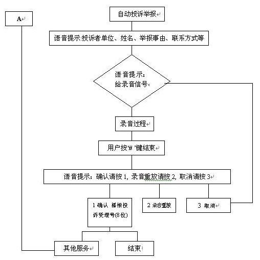 群眾通過自動(dòng)臺(tái)按照語音提示進(jìn)行投訴、舉報(bào)選擇錄音。自動(dòng)投訴舉報(bào)錄音流程如下: